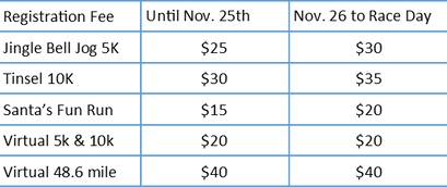 Giveaways: All in person registrants will receive a long sleeve performance t-shirt. All Children 15 and under participating in the Family Fun Run will receive a medal. Everyone that completes the Virtual 48.6 mile 12 Days of Christmas Challenge will receive a long sleeve performance T-shirt and medal upon completion. Participants of the 5k and 10k virtual run will receive a medal upon completion (no shirt).